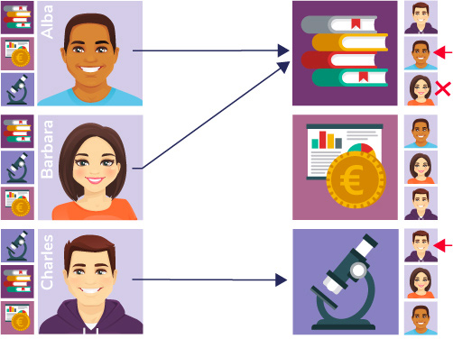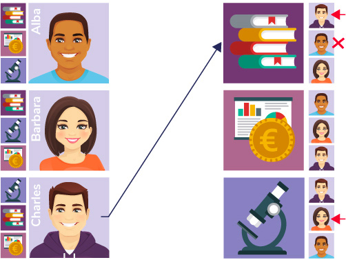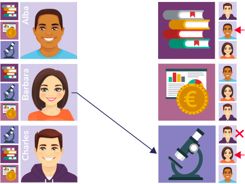 Il y a donc ensuite un second tour : les élèves qui ne sont pas encore affectés font une proposition à la formation correspondant à leur second vœux. Barbara va donc faire une proposition à l’université de Sciences. Cette dernière préfère Barbara, mais elle avait déjà accepté Charles. Elle va donc donc finalement accepter Barbara et rejeter la candidature de Charles qui se retrouve à son tour sans affectation !