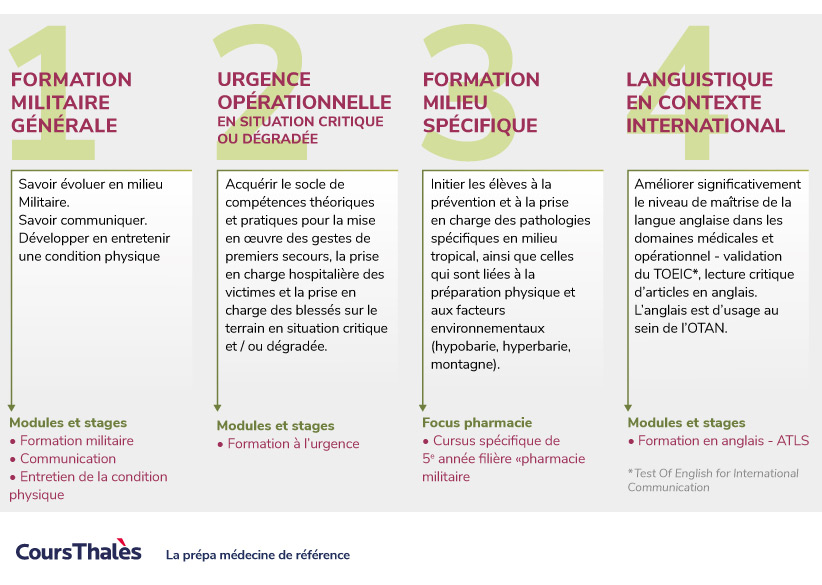 Pour exercer leur futur métier de praticien médical des armées, les étudiants vont étudier durant 1 800 heures de cours, travaux pratiques et stages, le tout répartis sur l’ensemble des 6 années d’études (en plus des années universitaires).