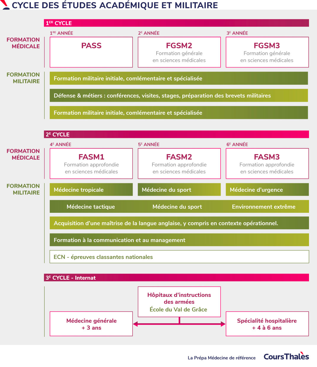 1 800 heures réparties sur les 6 années d’études en plus des études de médecine. Notre infographique vous résume l’essentiel à savoir des cycles :