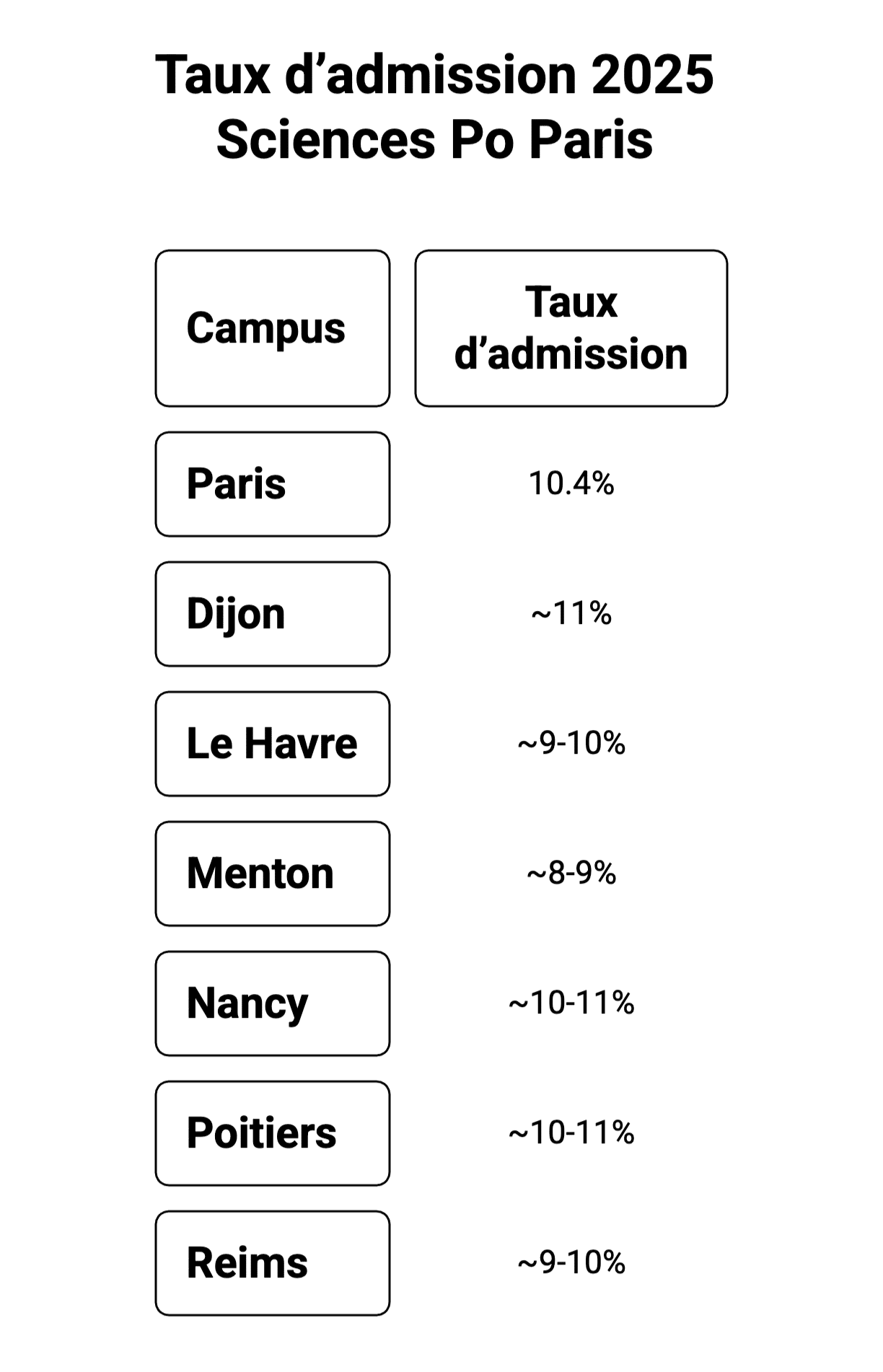 - Paris : ~8 à 10% d’admis, forte concurrence (42% internationaux)
