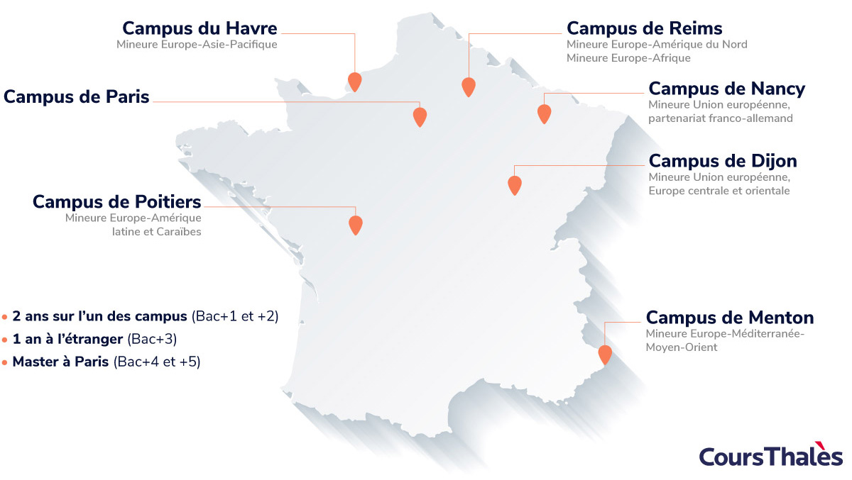 En plus du tronc commun, chaque campus propose des spécialisations régionales (Europe, Amériques, Asie, Moyen-Orient, etc.), ainsi que des projets pédagogiques et associatifs riches, permettant aux étudiants de s’impliquer activement dans la vie du campus et de se construire un parcours personnalisé, en phase avec leurs ambitions académiques et professionnelles.