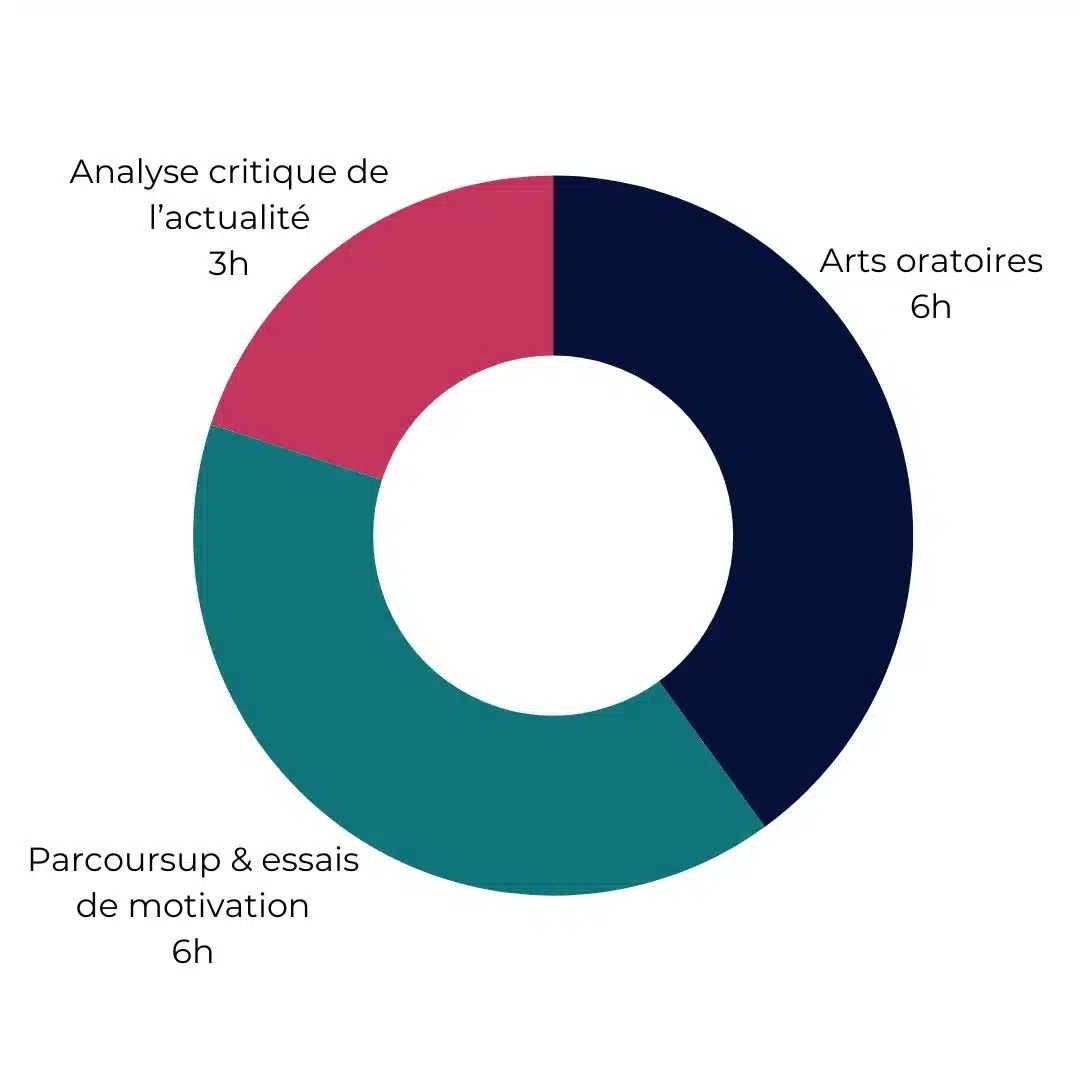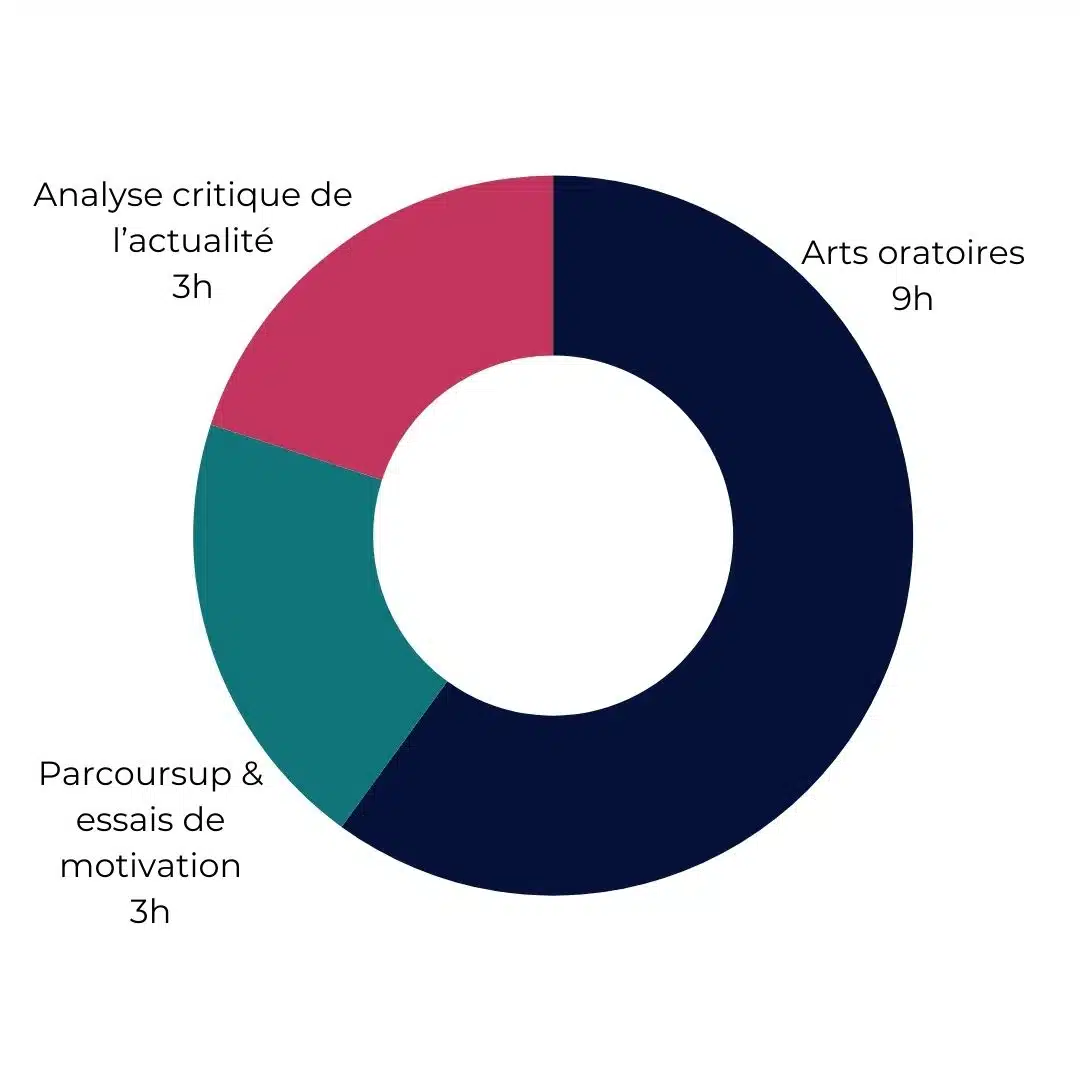- Arts oratoires : Plusieurs compétences sont enseignées au fil des différentes séances telles que la maîtrise du pitch introductif, l’analyse d’un document iconographique sans préparation préalable ou l’improvisation. L’objectif ? Préparer au plus tôt et dans la durée l’épreuve orale dont les secrets sont une préparation assidue sur le temps long.